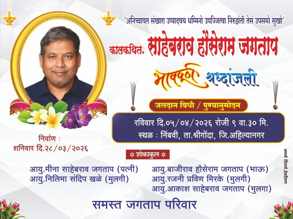 निंबवी ता. श्रीगोंदा, जि.अहिल्यानगर) : निंबवी (ता.श्रींगोदां जि अहिल्या नगर)येथील ठाणे परिवहन विभागातील निवृत्त कर्मचारी साहेबराव हौसेराम जगताप यांचे शनिवार, दि. २८ मार्च २०२६ रोजी दुःखद निधन झाले.